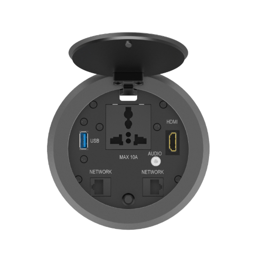 La boîte de table INFOBIT AV iBox TP fournit une solution de connectivité de salle de conférence pneumatique ronde pop-up multi-connexion extrêmement simple mais élégante.