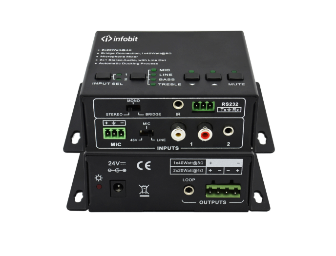 Deux entrées audio stéréo, commutables par bouton de panneau, télécommande IR et RS232
