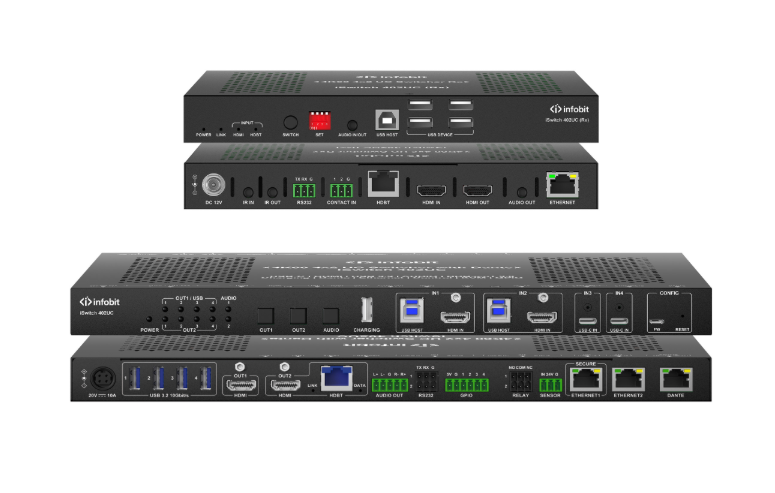 4× 2 commutateur de présentation de conférence, intégrant vidéo, audio, USB, contrôle et Ethernet.