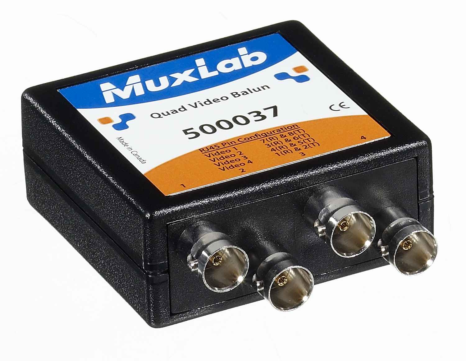 Le Quad Video Balun est disponible avec des connecteurs RCA (500032) ou BNC (500037) et fonctionne en conjonction avec d’autres baluns vidéo composites MuxLab tels que le 500000, 500009 et 500021.