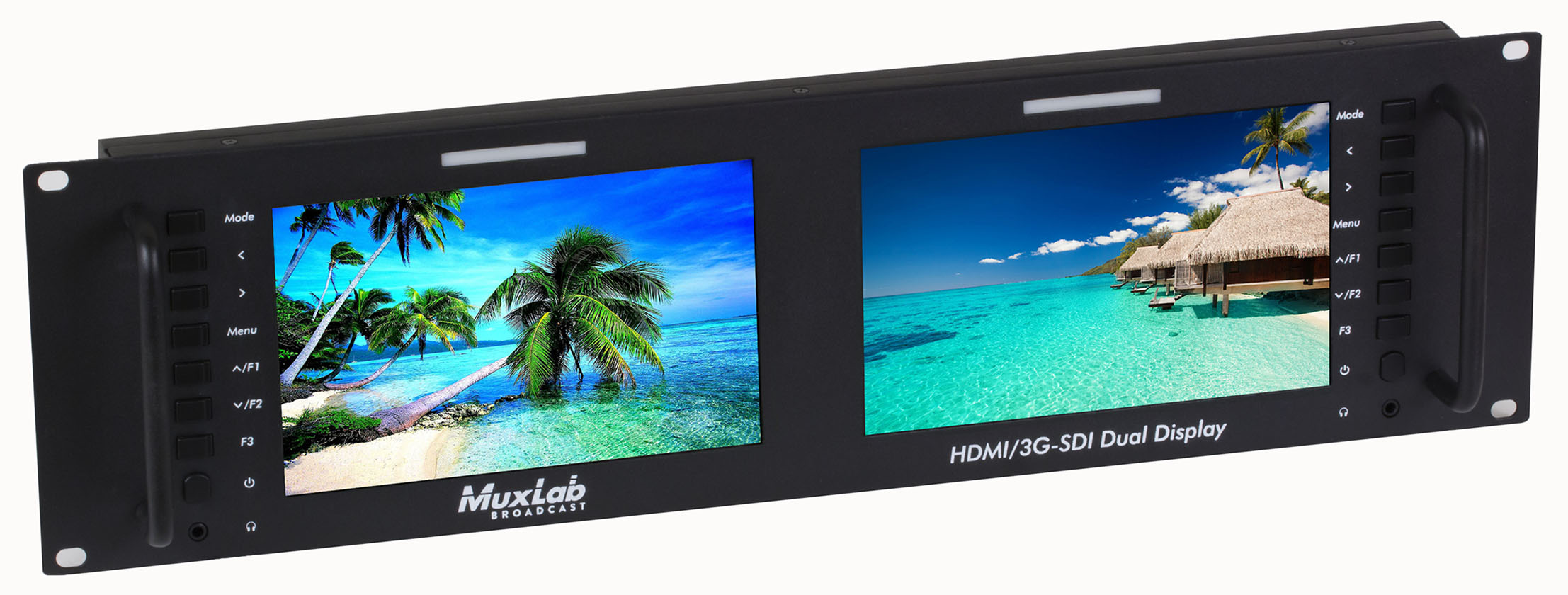 Le HDMI/3G-SDI Dual Display prend en charge, deux écrans IPS LCD indépendants de 7 pouces montés de manière pratique et sécurisée sur un rack 3 RU 19". Ces appareils permettent d’économiser une quantité significative d’espace dans les applications AV et Broadcast Pro multi-écrans.