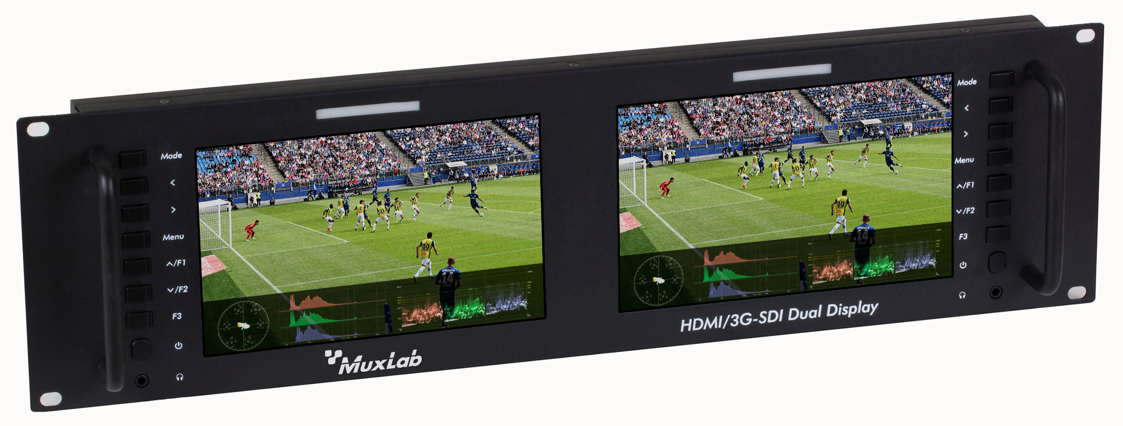 Le HDMI/3G-SDI Dual Display, 4K/30 (modèle : 500841-V2) prend en compte deux écrans IPS LCD indépendants de 7 pouces montés de manière pratique et sécurisée sur un rack 3 RU 19". Ces appareils permettent d’économiser une quantité significative d’espace dans les applications AV et Broadcast Pro multi-écrans.