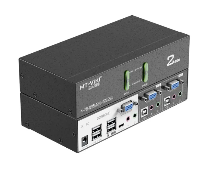 La sortie VGA du commutateur KVM MT-0201VK avec audio prend en charge DDC, il détectera automatiquement la meilleure résolution du moniteur. Cet élément peut non seulement commuter le signal vidéo mais aussi l'audio. Et le commutateur KVM à 2 ports dispose d'un concentrateur USB pour connecter plusieurs périphériques USB. Vous pouvez contrôler deux ordinateurs avec un ensemble de clavier, souris et moniteur. Fournit un mode de commutation pratique : bouton-poussoir, contrôleur de bureau, raccourci clavier.