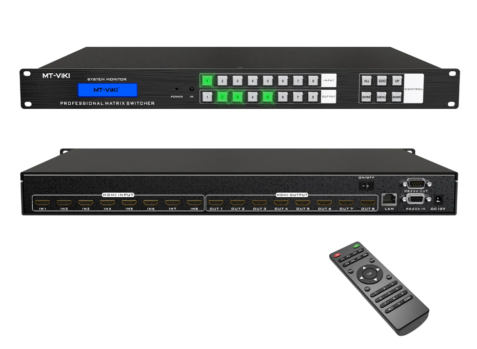 Cette matrice HDMI 8 × 8 est un appareil de commutation professionnel haute performance avec contrôle intelligent intégré, il peut entrer 8 sources HDMI et sortir sur 8 téléviseurs HDMI, avec entrée/sortie RS232, affichage numérique LED et LAN.