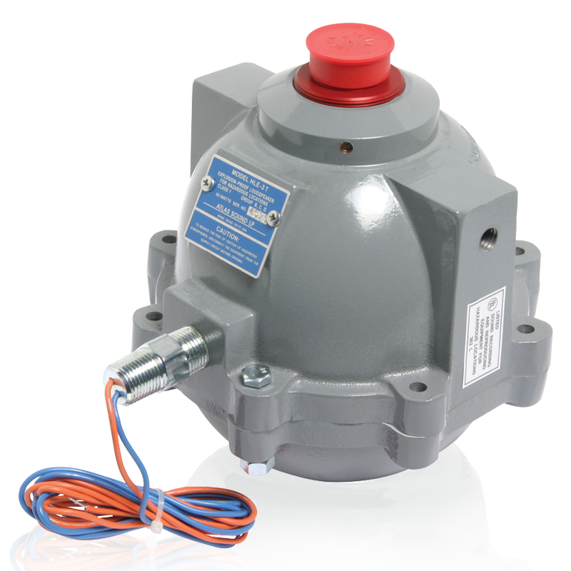 HLE-3T speaker is an explosion-proof compression driver engineered for high-efficiency voice and electronic signal communication in hazardous areas. The driver is protected within a rugged die-cast aluminum housing, and have 60-watt power handling. Includes a factory-installed, internally mounted transformer (Note: To meet UL requirements transformer must be factory installed). Model is equipped with a pipe seal with integral field wiring leads, and an adjustable mounting bracket.