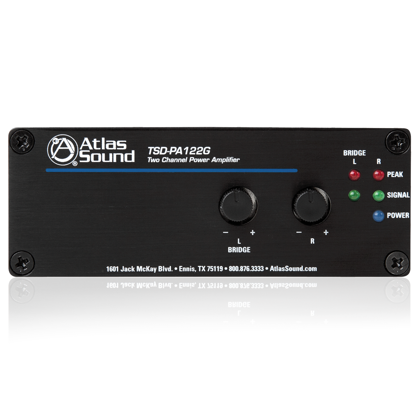 The TSD-PA122G 4Ω stereo amplifier is perfectly suited for almost any general amplification requirement. Perfect for adding sound reinforcement to small projector systems as it provides ample power to drive up to four 8Ω speakers in a classroom or boardroom application. Output is 12W per channel at 4Ω or 24W bridged mono at 8Ω. Input is via balanced stereo phoenix style and unbalanced RCA connectors. Front panel gain controls provide adjustment for both left/right or bridged outputs and include removable knobs.
