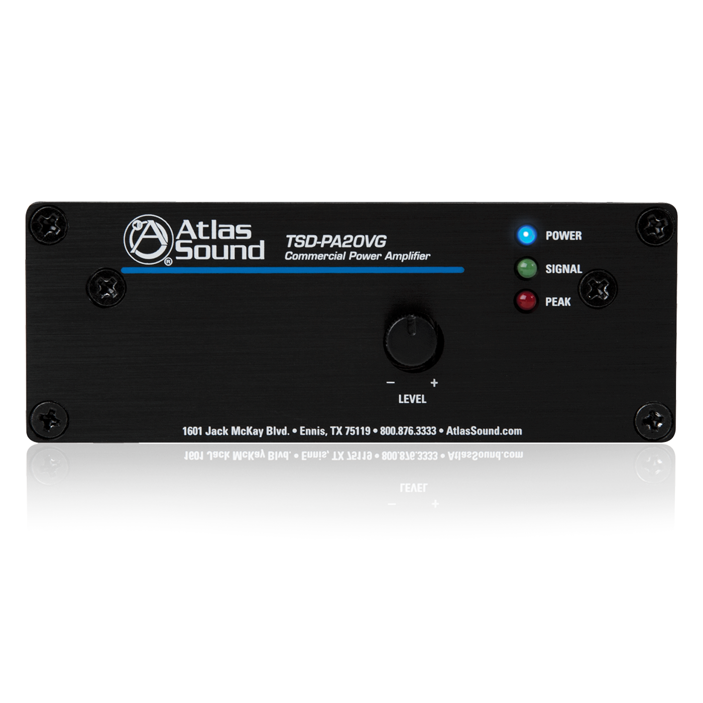 The TSD-PA20VG is a cost effective mono amplifier for 4Ω and distributed constant voltage speaker systems. Applications include hallways and classrooms. The TSD-PA20VG is also a cost effective alternative for small projector systems as it can be used with as many as (16) 25/70/100V ceiling speakers (tapped at 1W each), plus the extremely small footprint allows for easy mounting.