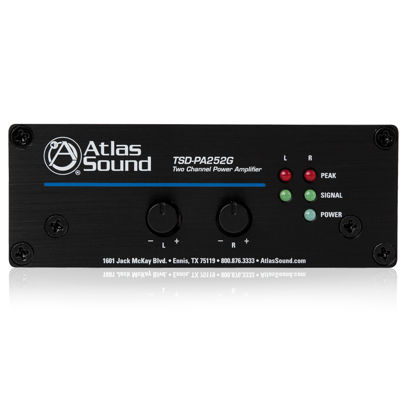 The TSD-PA252G is a reliable, cost effective 4Ω stereo amplifier well suited for higher power amplification requirements. Output is 25W per channel at 4Ω or 50W bridge mono at 8Ω. Input is via balanced stereo phoenix style and unbalanced RCA connectors. Front panel gain controls provide adjustment for both left/right or bridged outputs and include removable knobs.