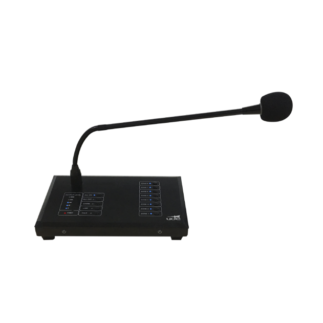 PA microphone desk compatible with the MX-1800 matrix. Allows to manage the broadcasting of announcements or messages to 8 zones, with independent message broadcasting.