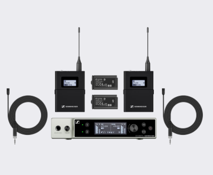C'est ensemble cravate sans fil comprend 2 modules EW-DX SK (émetteur de poche sans fil), 2 microphones MKE 2 (micro cravate omnidirectionnel), 1 récepteur rack EW-DX EM 2 (2 canaux) et 2 batteries rechargeables BA 70.