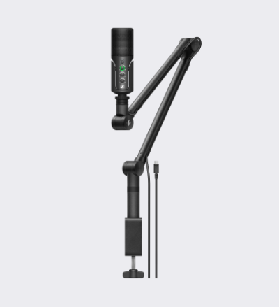 - Le Profile Streaming Set comprend un microphone, un bras articulé avec gestion interne du câble, un câble USB-C de 3 m et une pochette pour le micro