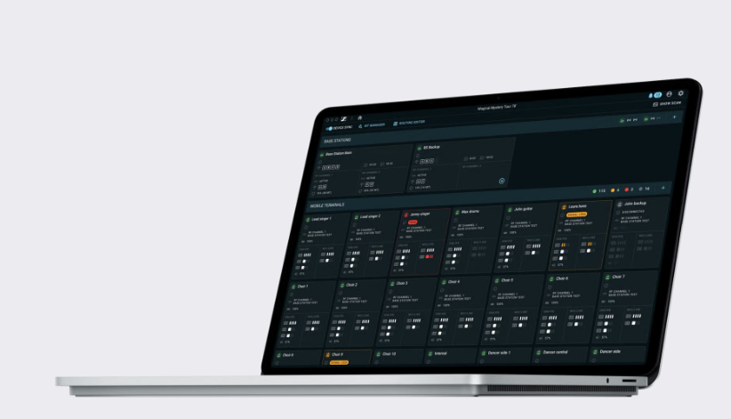 - Possibilités de contrôle et de surveillance à distance sans précédent, ainsi qu’une visibilité sur le volume des retours in-ear, la latence, le niveau et les paramètres audio, l’état RF, la charge de la batterie, etc.