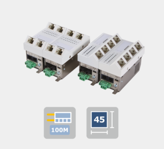 - Le Micro-Switch Gigabit Ethernet le plus petit et le plus compact du marché, de conception M45, pour une installation sans outil dans les conduits de câbles, les réservoirs au sol, etc.
