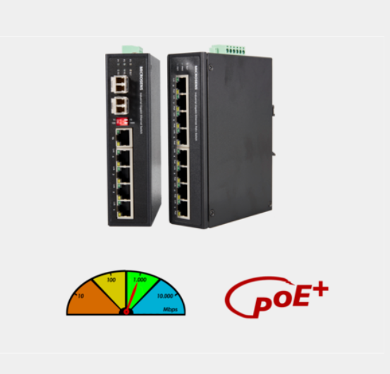- Cost-effective plug and play Gigabit and PoE+ performance for industrial environments with DIN rail adapter and extended operating temperature range -40°..+75°C