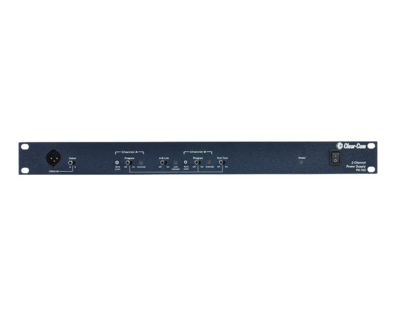 The PS-702 can supply up to 2 amps at 30 volts DC to two channels in a 1RU. This is sufficient to power up to 40 beltpacks,10 speaker stations, or 12 headset stations even under the most demanding conditions. Either channel is capable of supplying up to 1.2 amps. The full current capacity may be divided between the two channels.