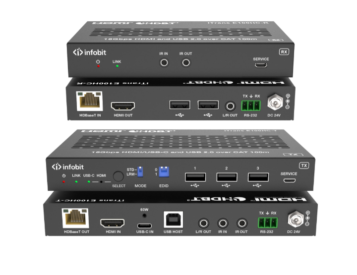 Caractéristiques TX avec 1x entrée HDMI, 1x entrée USB-C, 1x sortie HDBT, 1x hôte USB 2.0 et 3x clients USB 2.0