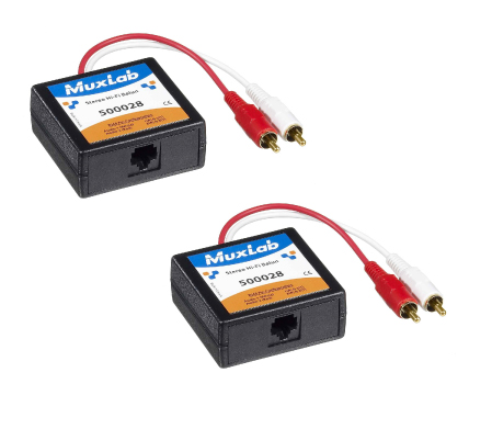 Le MuxLab Stereo Hi-Fi Balun Kit (500028-2PK) permet de transmettre un signal audio analogique Hi-Fi stéréo asymétrique au niveau ligne via un seul câble Cat5e/6 en connexion point à point jusqu’à 3 250 pieds / 1 km.