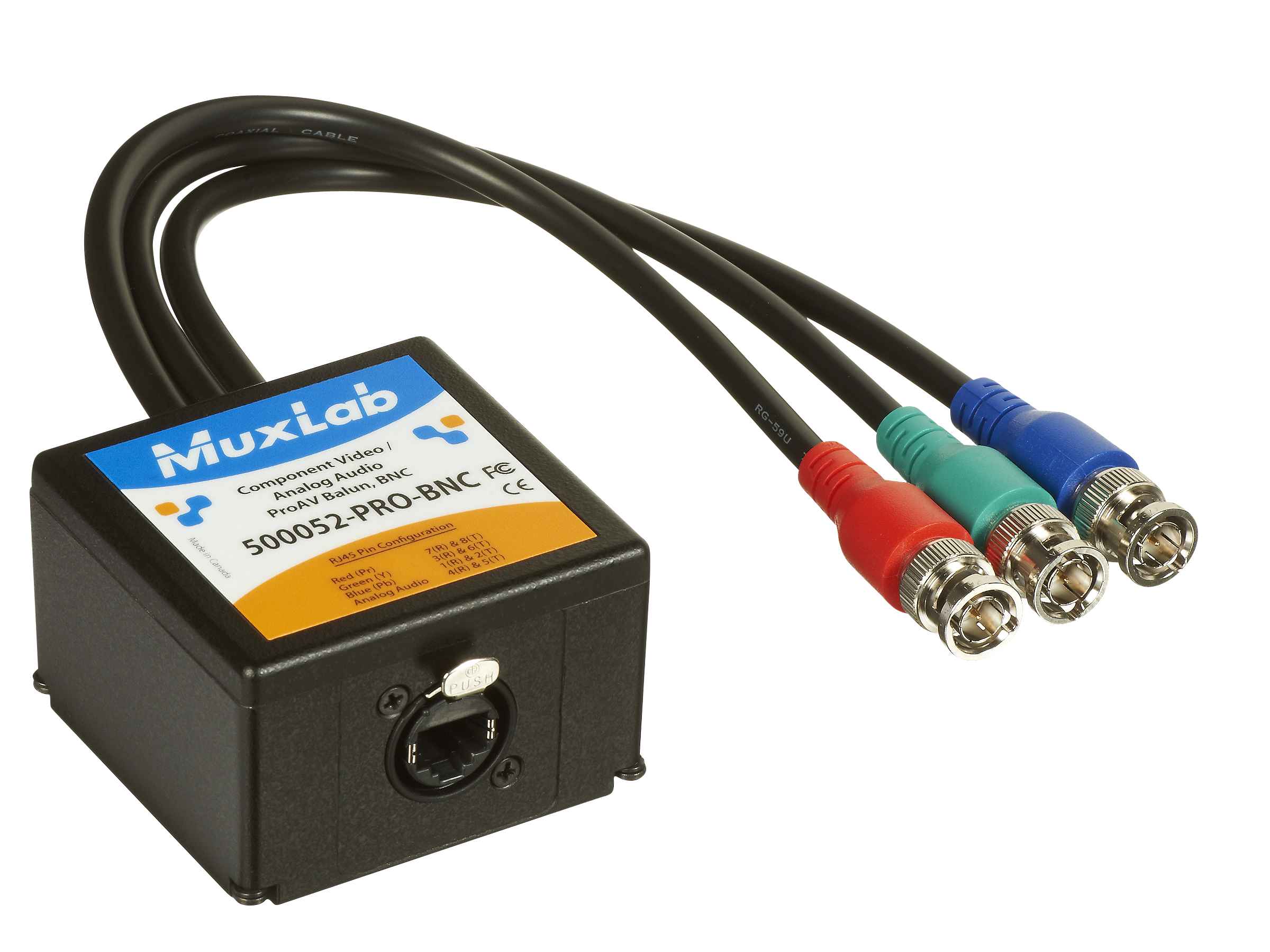 Le 500052-Pro est équipé d’un Ethercon RJ45, d’un boîtier en aluminium moulé robuste et de câbles AV robustes intégrés de 12 pouces (30 cm) adaptés à un environnement professionnel exigeant. Le 500052-Pro peut être utilisé en binôme ou en conjonction avec d’autres baluns vidéo composantes MuxLab.