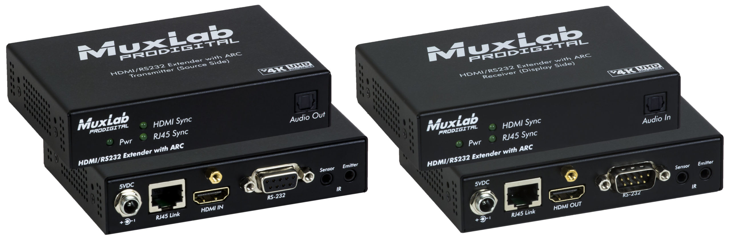 Le kit prolongateur HDMI/RS232 avec ARC, HDBT, UHD-4K (500458-ARC) permet de connecter des équipements HDMI jusqu’à 131ft (40 m) en résolution 4K/30 (4:4:4) et 4K/60 (4:2:0), ou 230 ft (70 m) à des résolutions allant jusqu’à 1080p via un (1) câble torsadé non blindé Cat 5e/6 en configuration point à point. Le kit prend en charge le canal de retour audio (ARC), permettant au récepteur de renvoyer l’audio d’un appareil de souche tel qu’une smart TV vers l’émetteur puis vers un système audio. Le signal ARC d’origine peut être reçu via le port HDMI ou TosLink du 500458-ARC-RX et transmis via le port TosLink-out du 500458-ARC-TX. L’unité est conforme à la norme HDCP 2.2 et prend en charge la transmission RS232 ainsi que la transmission IR bidirectionnelle pour la télécommande des appareils finaux. Le kit comprend un (1) émetteur, un (1) récepteur, un (1) émetteur IR, un (1) capteur IR et deux (2) alimentations.