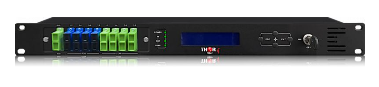 La puissance de sortie totale maximale de l'appareil peut atteindre +37 dBm et il prend en charge jusqu'à 16 sorties, avec commutation optique, CWDM et détection RF en option. Il intègre un logiciel de gestion de réseau basé sur le protocole SNMP et une interface de gestion web, idéal pour la transmission amplifiée de signaux optiques descendants à 1550 nm dans les réseaux FTTH. Cet EDFA haute puissance avec port PON est spécialement conçu pour les fournisseurs d'accès déployant des offres Triple Play (télévision par câble, internet haut débit et téléphonie VoIP) sur une infrastructure fibre unique. L'EDFA Thor avec ports PON est un amplificateur optique spécialisé qui combine l'amplification du signal vidéo RF (CATV) avec les services de données d'un système PON. Il est conçu pour amplifier simultanément le signal vidéo diffusé à 1550 nm et transmettre les longueurs d'onde de données 1490/1310 nm utilisées dans les systèmes PON, le tout dans un seul appareil.