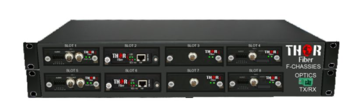 Les systèmes Thor Fiber Chassis sont conçus pour une flexibilité optimale. Nos systèmes basés sur le châssis F intègrent des multiplexeurs optiques WDM, CWDM ou DWDM pour le transport de données par fibre optique. Il vous suffit de sélectionner les modules souhaités ; notre système se charge du reste. Nos modules standard incluent le transport DVB ASI sur fibre, l'Ethernet Gigabit sur fibre, la vidéo avec audio sur fibre et des encodeurs/décodeurs numériques. Combinez différents types de signaux et changez même les modules après installation : nos systèmes basés sur le châssis F sont les systèmes de multiplexage optique les plus polyvalents du marché. Nos châssis sont équipés de LED de diagnostic faciles à lire pour l'état de la liaison optique. Nous proposons également une option de gestion SNMP pour la surveillance à distance du système. L'unité est livrée avec des connecteurs fibre optique SC ou SC/APC standard.