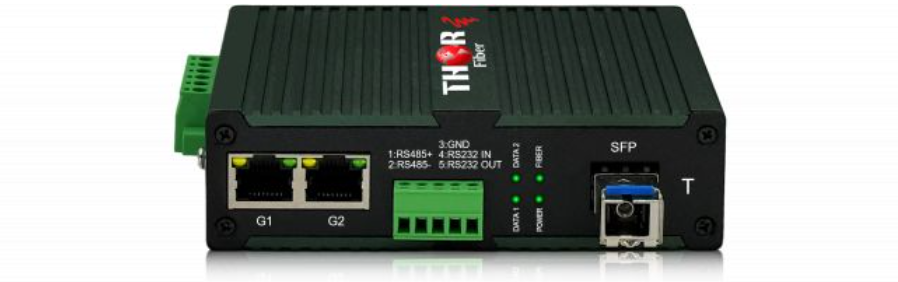 Convertisseurs fibre optique Thor Fiber Multi-Serial (RS-232 / RS-485) + 2 x RJ45 qui transmettent un protocole série sur fibre avec 2 ports pour le transport Ethernet.