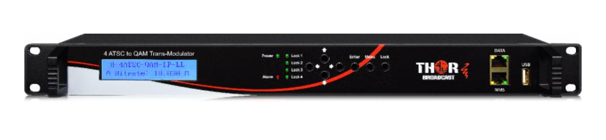 Les systèmes de transmodulation Thor Broadcast sont des modulateurs à 4 entrées RF et des multiplexeurs de flux de programme avec prise en charge CAM via 4 emplacements CI. Ils sont compatibles avec les sources de signaux radiofréquences QAM (DVB-C), satellite (DVB-S/S2) et terrestre (ATSC/DVB-T). Le type de signal RF est facilement interchangeable par simple retrait des modules (la modulation étant matérielle, elle ne peut être modifiée par mise à jour du firmware). La configuration et la gestion complètes sont accessibles via l'écran LCD et le clavier en façade. L'accès et la surveillance à distance sont possibles via un port réseau NMS dédié, permettant le contrôle par navigateur web. Les flux de programme, ainsi que les entrées IP et ASI, peuvent être multiplexés et réaffectés dans n'importe quel ordre. Les sorties indépendantes pour ASI et IP sont entièrement configurables. La prise en charge standard de l'accès conditionnel est assurée par 4 emplacements d'interface commune (CI). Ces emplacements prennent en charge les modules CAM tels que CableCard ou tout autre système utilisant l'interface PCMCIA. Cette plateforme est idéale pour l'agrégation et le multiplexage de programmes dans les têtes de réseau de télévision par câble et les systèmes MATV d'entreprise.