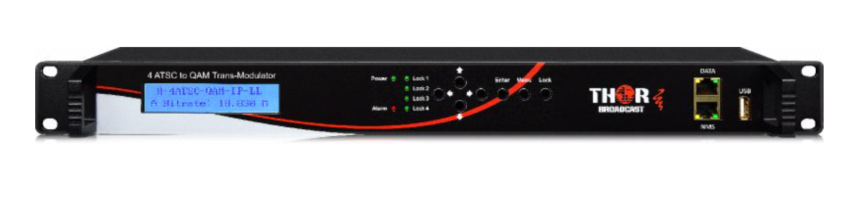 Les systèmes de transmodulation Thor Broadcast sont des modulateurs à 4 entrées RF et des multiplexeurs de flux de programme avec prise en charge CAM via 4 emplacements CI. Ils sont compatibles avec les sources de signaux radiofréquences QAM (DVB-C), satellite (DVB-S/S2) et terrestre (ATSC/DVB-T). Le type de signal RF est facilement interchangeable par simple retrait des modules (la modulation étant matérielle, elle ne peut être modifiée par mise à jour du firmware). La configuration et la gestion complètes sont accessibles via l'écran LCD et le clavier en façade. L'accès et la surveillance à distance sont possibles via un port réseau NMS dédié, permettant le contrôle par navigateur web. Les flux de programme, ainsi que les entrées IP et ASI, peuvent être multiplexés et réaffectés dans n'importe quel ordre. Les sorties indépendantes pour ASI et IP sont entièrement configurables. La prise en charge standard de l'accès conditionnel est assurée par 4 emplacements d'interface commune (CI). Ces emplacements prennent en charge les modules CAM tels que CableCard ou tout autre système utilisant l'interface PCMCIA. Cette plateforme est idéale pour l'agrégation et le multiplexage de programmes dans les têtes de réseau de télévision par câble et les systèmes MATV d'entreprise.