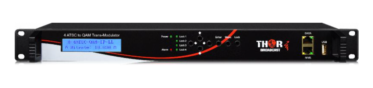 Les systèmes de transmodulation Thor Broadcast sont des modulateurs à 4 entrées RF et des multiplexeurs de flux de programme avec prise en charge CAM via 4 emplacements CI. Ils sont compatibles avec les sources de signaux radiofréquences QAM (DVB-C), satellite (DVB-S/S2) et terrestre (ATSC/DVB-T). Le type de signal RF est facilement interchangeable par simple retrait des modules (la modulation étant matérielle, elle ne peut être modifiée par mise à jour du firmware). La configuration et la gestion complètes sont accessibles via l'écran LCD et le clavier en façade. L'accès et la surveillance à distance sont possibles via un port réseau NMS dédié, permettant le contrôle par navigateur web. Les flux de programme, ainsi que les entrées IP et ASI, peuvent être multiplexés et réaffectés dans n'importe quel ordre. Les sorties indépendantes pour ASI et IP sont entièrement configurables. La prise en charge standard de l'accès conditionnel est assurée par 4 emplacements d'interface commune (CI). Ces emplacements prennent en charge les modules CAM tels que CableCard ou tout autre système utilisant l'interface PCMCIA. Cette plateforme est idéale pour l'agrégation et le multiplexage de programmes dans les têtes de réseau de télévision par câble et les systèmes MATV d'entreprise.