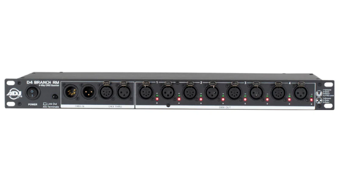 The ADJ D4 Branch RM is a single rack space, 4-way distributor/booster with 3-pin and 5-pin XLR input and output jacks.