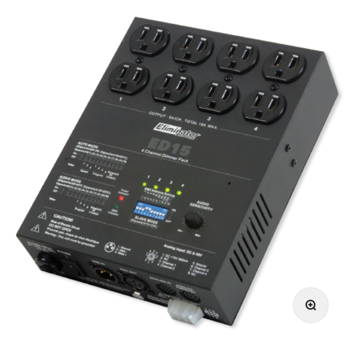 Take control of your light show with Eliminator’s ED-15. Its unique 4-channel dimmer pack is designed to control your light fixtures movement. This 15-amp controller features 16 automatic and sound activated built-in programs. The ED-15 also features 450 watts per channel and comes with analog in and out points. No more stress or headaches! Let the ED-15 take control of your light show. Great for home bars and party rooms.