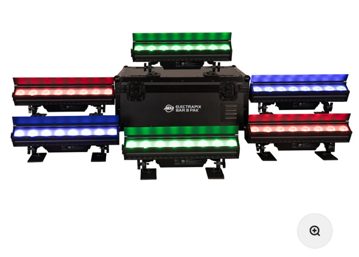 The ElectraPix Bar 8 Pak features six (6) ElectraPix Bar 8 Battery powered, wireless DMX LED linear fixtures housed in a robust road case with dedicated charging slots for each fixture. It is supplied with an ADJ UC-IR24 remote control that allows simple color selection as well as a power cable which plugs into the side of the case for in-case charging.