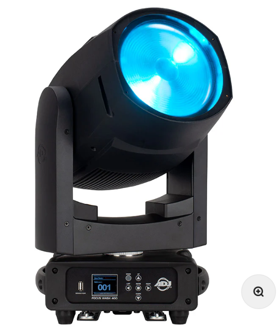 The FOCUS WASH 400 is a 400W, RGBACL (Red, Green, Blue, Amber, Cyan and Lime) LED moving head wash with a 10 to 41 degree motorized zoom, with flicker free operation for TV and film, linear white color temperature control from 2700K - 6500K, and virtual CMY color mixing.