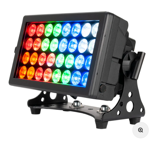 The ADJ 32 HEX Panel IP is an IP65 rated multi-functional wash / blinder / color strobe fixture for indoor or outdoor use. It features 32x 12W HEX LEDs (6-IN-1 – RGBWA+UV), 8 individually controlled sections with Pixel Zone Control and a 24-degree beam angle. All metal, black housing.