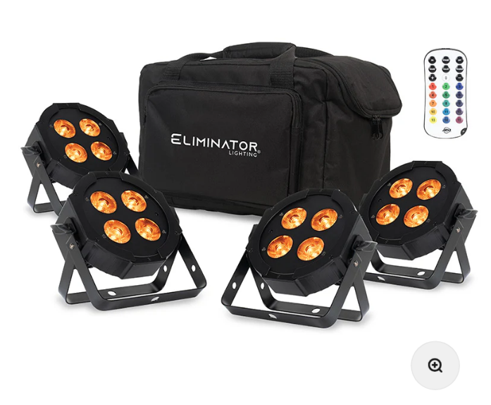 Elevate your lighting game with the Eliminator Lighting Mega Flat Hex L Pak4! The perfect uplighting kit for lighting pros on the go. With 4 lightweight LED pars, a carrying bag, a wireless remote, plus power and DMX cables, the Mega Flat Hex L Pak4 is perfect for temporary use for events and small stages.