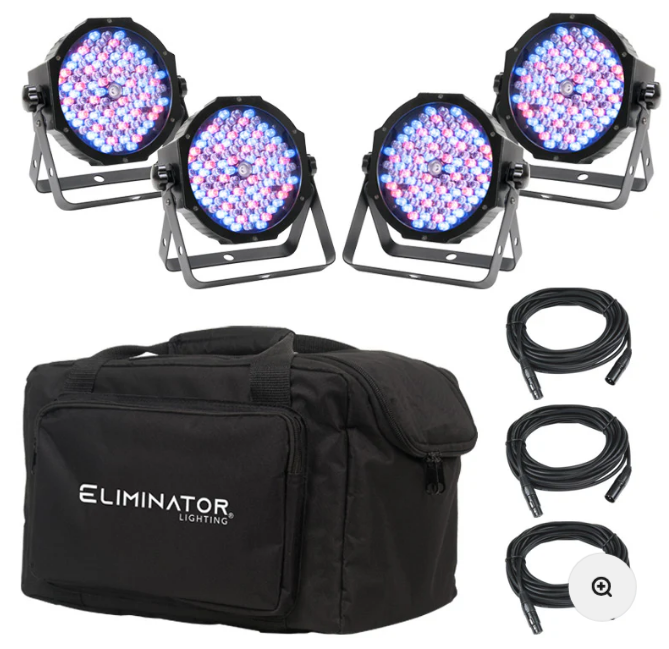 The Eliminator Lighting Mega Flat Pak EP is a convenient solution for the mobile entertainer to provide uplighting or mobile stage at any event. This lighting system includes: 4x Eliminator Lighting Mega Par Profile EP Pars, 4x (1M/3ft.) IEC to Edison power cables, 3x (6ft/2M) DMX Cables and a soft transport bag.