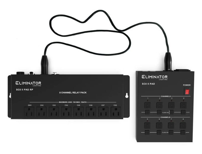 The Eliminator Lighting SC8 II Pad System in an analog On/Off controller with 8 channels and helps eliminate tangled cords and messy wires. The system includes: 1x SC8 II Pad controller, 1x SC8 II PAD RP relay Pack, 1x 25ft. 3-pin DMX Cable and 1x 4ft. IEC Power Cord.