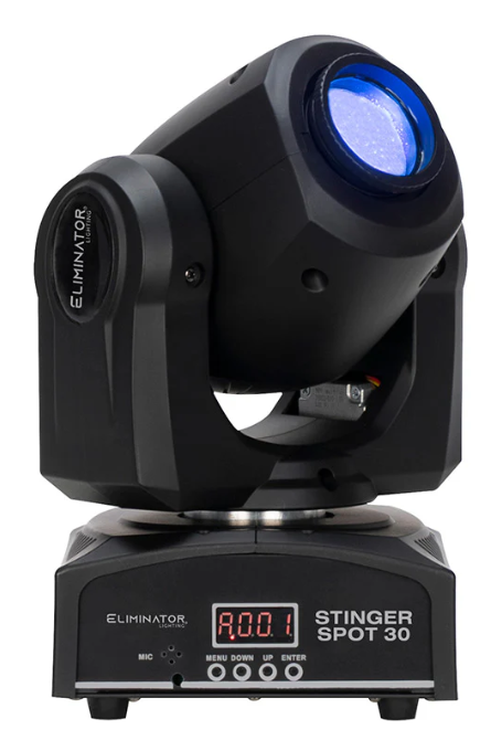 The Eliminator Lighting Stinger Spot 30 is a mini Moving Head with a crisp 30-Watt LED source and advanced optics, and separately GOBO and color wheels. Control via DMX-512, Sound Active or 8 built-in programs.