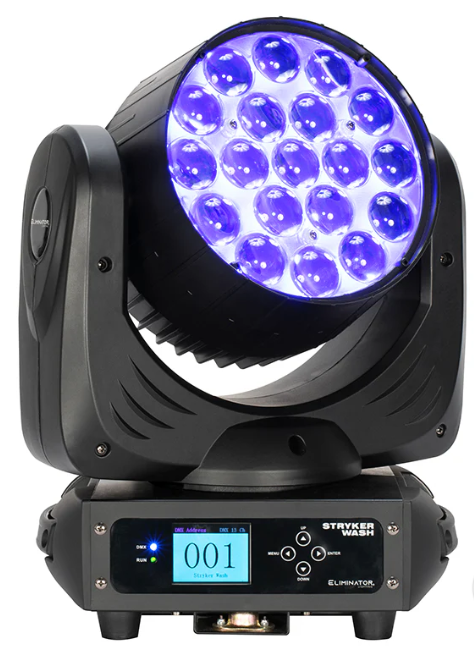 228W professional moving head wash fixture with variable motorized zoom (6 ~ 50-degrees), 19x 12W quad color 4-in-1 (RGBW) LEDs with 3 zones of LED ring control and tunable white color temperature control from 3,200-10,000K