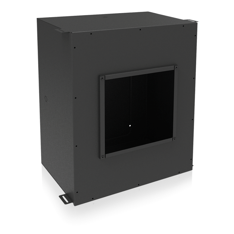 Two sets of slotted mounting tabs are welded on parallel sides to accept Model QR30 mounting channels (optional) for mounting the enclosure in the ceiling. These mounting tabs may also be used for any specific mounting technique developed by the installer. It is important that the sound contractor take particular note of the weight of these enclosures to determine suitable mounting procedures. The entire metal enclosure is finished in black textured epoxy. Models with a volume of 1-3 cu. ft include 1/2" fiberboard. Models with a volume of 4-6 cu. ft include 1" fiberboard.