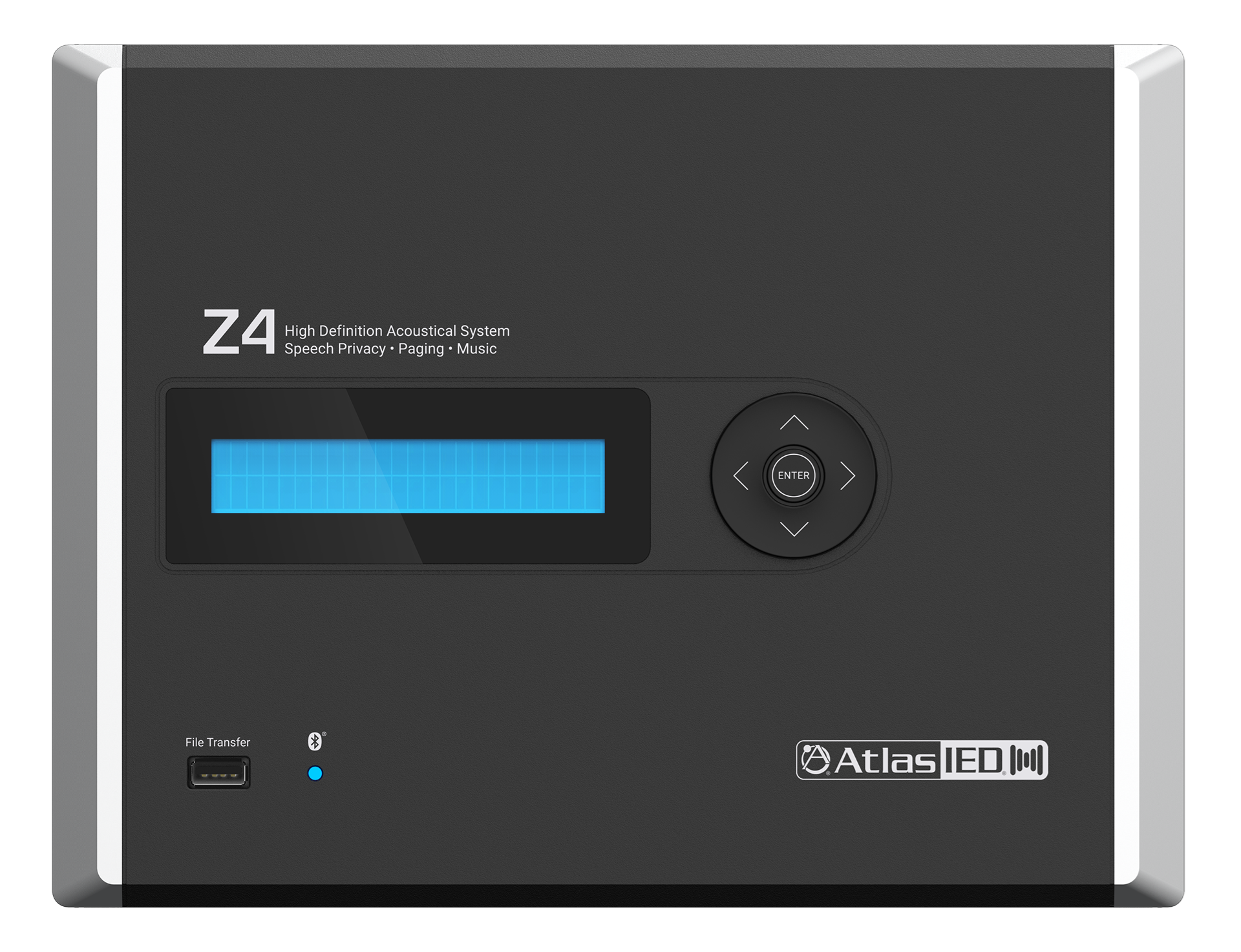 For conference room applications where secure speech privacy is required, the Z4-B features a Speech Privacy Enhancement mode that can be engaged while a meeting is in progress. Speech Privacy Enhancement mode applies additional acoustical energy to the surrounding environment, increasing the privacy levels for the conference room occupants. AtlasIED has been developing, manufacturing, and assisting and commissioning sound masking systems for over forty years using proprietary Chanaud masking Filters. These unique secured speech filters have been approved and implemented in many installations around the world including military and government facilities. Activation of the Speech Privacy Enhancement feature is accomplished by hardwired switch, an iOS® or Android® application, or using an optional wireless desktop / wall mount switch. An optional wired or wireless sign is available for a visual aid to notify attendees when Speech Privacy Enhancement is active.