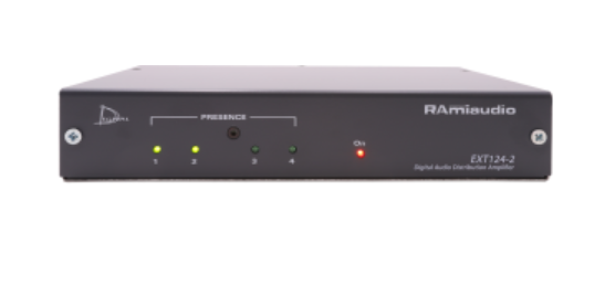 L'EXT124-2 est un amplificateur de distribution permettant la transmission d'un signal audio numérique vers quatre départs de même type ou de deux signaux numériques vers deux départs.