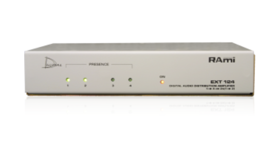 L'EXT124 est un amplificateur de distribution permettant la transmission d'un signal audio numérique vers 4 départs de même type ou de deux signaux numériques vers deux départs.