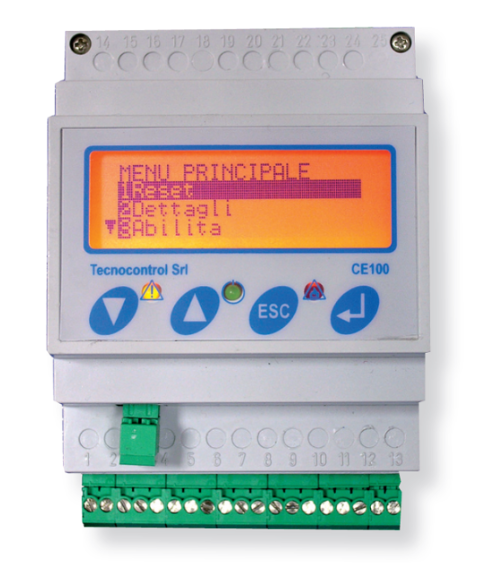 La centrale gaz CE100 Town, est réalisée en boîtier DIN (encombrement 4 modules) comme tous les autres produits qui lui sont associés. Elle est constituée d'une unité de d'élaboration des données avec écran graphique 122x32 points rétro-illuminé, d'un clavier pour la programmation et la consultation du menu et de la carte de gestion des entrées et sorties.