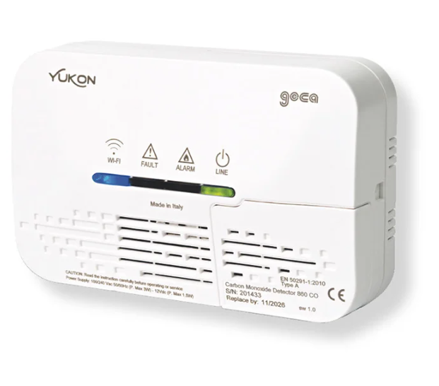 Détecteur domestique de Monoxyde de Carbonemural. Yukon CO permet le maintient d’un haut niveau de sécurité dans les locaux d’habitation. Contrôle en permanence la présence de monoxyde de carbone dans l’air et avise l’utilisateur en temps réel dans le cas ou se présente un cas de dépassement des seuils de sécurité. Le Yukon CO possède une signalisation par LED, Buzzer Acoustique et un Relais qui s’active au dépassement des seuils exprimés en ppm de la valeur de monoxyde de carbone définie en conformité de la norme EN 50291-1:2018. En cas de situation de danger, le dispositif active la signalisation Optico-Acoustique ( LED, Buzzer interno), actionne le Relais interne et envoie une notification ,via App dédiée, sur le smarphone de l'utilisateur.