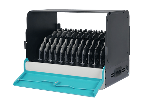 Station de chargement pour 12 appareils (tablettes, ordinateurs portables, etc. L'AVer E12 offre des options compactes et « faites-le vous-même », parfaites pour les salles de classe où la place compte. Sa porte à ouverture facile permet aux élèves, même les plus jeunes, d'accéder à tout moment aux appareils pédagogiques. L'espacement des adaptateurs secteur indépendants assure une distribution optimale de la chaleur, ce qui maintient les appareils à des températures acceptables. D'autre part, les divisions de taille réglable et les attaches pour câbles flexibilisent l'insertion d'appareils différents entre eux.